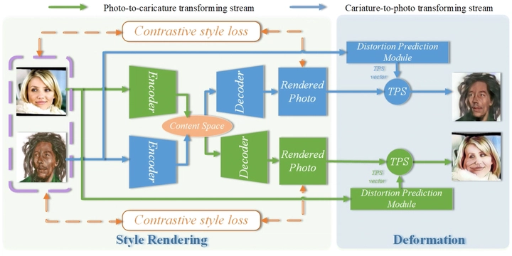 Photo-to-caricature translation aims to synthesize the caricature as a rendered image exaggerating the features through sketching, pencil strokes, or other artistic drawings. Style rendering and geometry deformation are the most important aspects in photo-to-caricature translation task. To take both into consideration, we propose an unsupervised contrastive photo-to-caricature translation architecture. Considering the intuitive artifacts in the existing methods, we propose a contrastive style loss for style rendering to enforce the similarity between the style of rendered photo and the caricature, and simultaneously enhance its discrepancy to the photos. To obtain an exaggerating deformation in an unpaired/unsupervised fashion, we propose a Distortion Prediction Module (DPM) to predict a set of displacements vectors for each input image while fixing some controlling points, followed by the thin plate spline interpolation for warping. The model is trained on unpaired photo and caricature while can offer bidirectional synthesizing via inputting either a photo or a caricature. Extensive experiments demonstrate that the proposed model is effective to generate hand-drawn like caricatures compared with existing competitors.