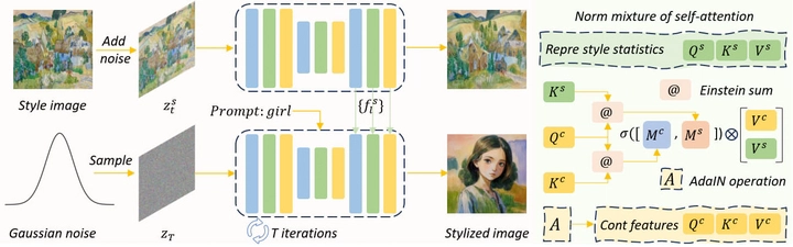 Although diffusion models exhibit impressive generative capabilities, existing methods for stylized image generation based on these models often require textual inversion or fine-tuning with style images, which is time-consuming and limits the practical applicability of large-scale diffusion models. To address these challenges, we propose a novel stylized image generation method leveraging a pre-trained large-scale diffusion model without requiring fine-tuning or any additional optimization, termed as OmniPainter. Specifically, we exploit the self-consistency property of latent consistency models to extract the representative style statistics from reference style images to guide the stylization process. Additionally, we then introduce the norm mixture of self-attention, which enables the model to query the most relevant style patterns from these statistics for the intermediate output content features. This mechanism also ensures that the stylized results align closely with the distribution of the reference style images. Our qualitative and quantitative experimental results demonstrate that the proposed method outperforms state-of-the-art approaches.